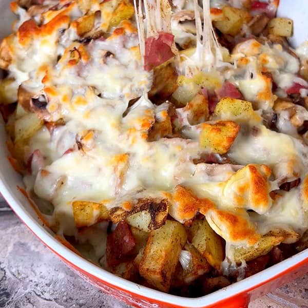 بعد در یک ظرف نسوز مناسب سیب زمینیهای سرخ شده و قارچها و ژامبونها را بریزید و کمی پنیر پیتزا هم اضافه کنید و با هم مخلوط کنید، سپس به مقدار دلخواه نمک، فلفل سیاه، پاپریکا و آویشن، پودر سیر و تخم گیشنیز را روی مواد بریزید.